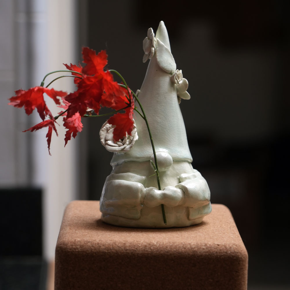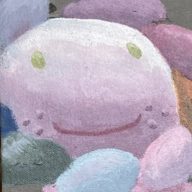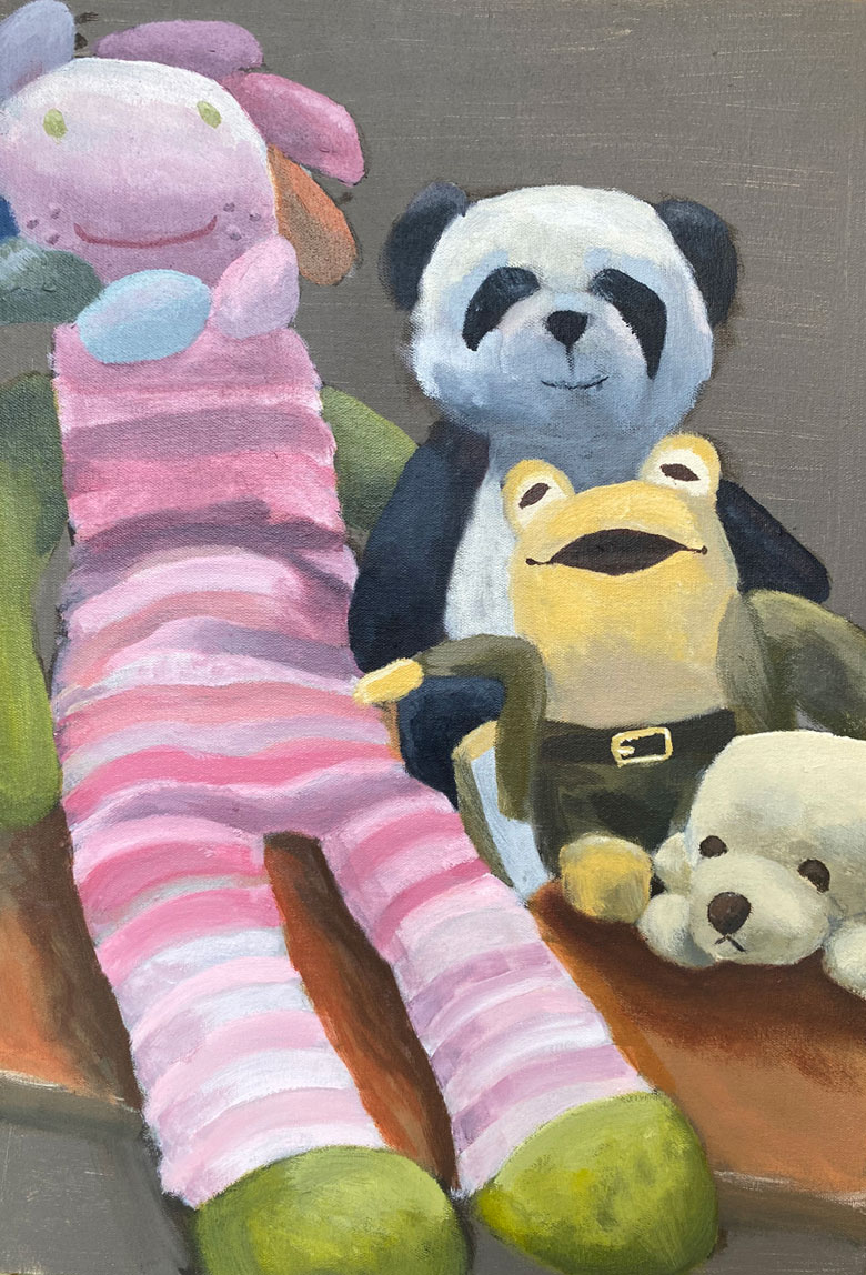 still life with stuffed animals (acrylic on canvas)ceramic artichokecrocheted bagself portrait (pen on paper)omoshiroi/funny (print)