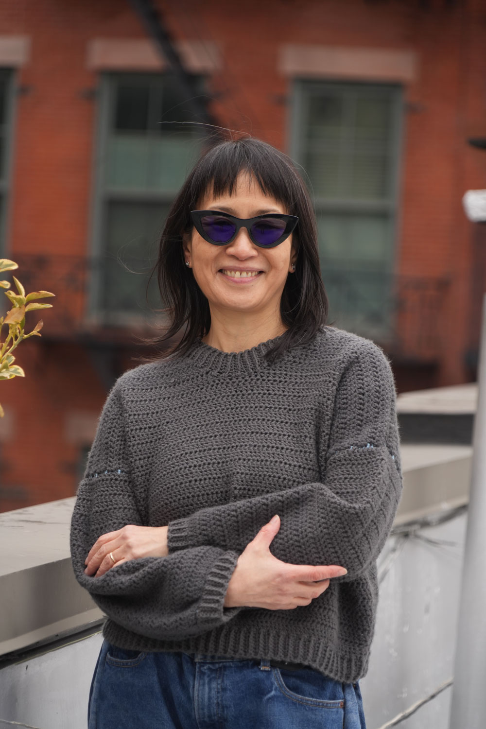 crocheted bag with matching embellished t-shirt and upcycled jeanscoffeehouse emceecustom crocheted sweaterceramic gnome